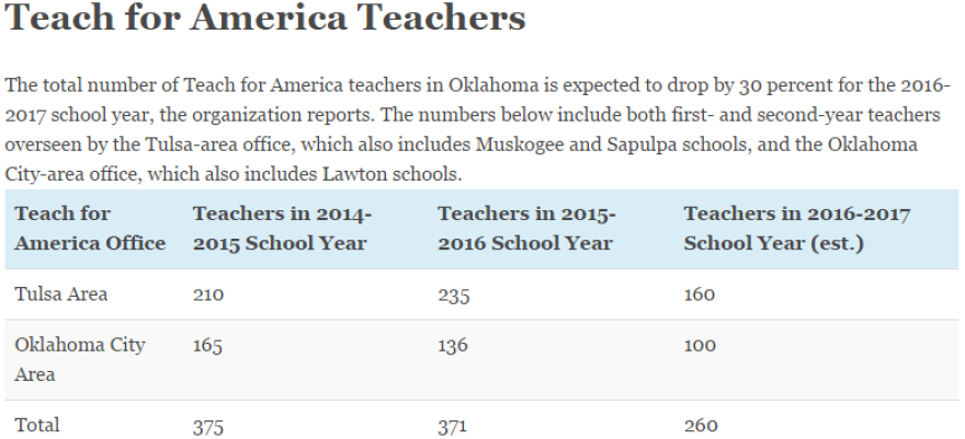 There will be 30 percent fewer Teach for America teachers in Oklahoma classrooms this fall, compared to last year, based on data provided by Teach for America. School districts still need teachers, but fewer applications are coming in. Nationally, applications to the program are down 35 percent over three years.